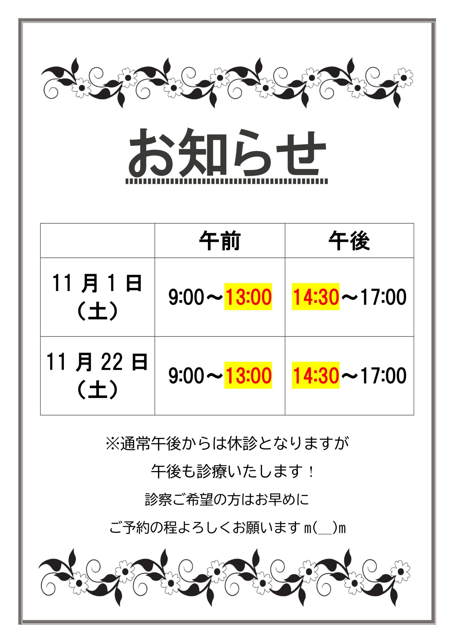 🍀1日(土)、22日(土)は通常午前診療ですが、午後も診療致します