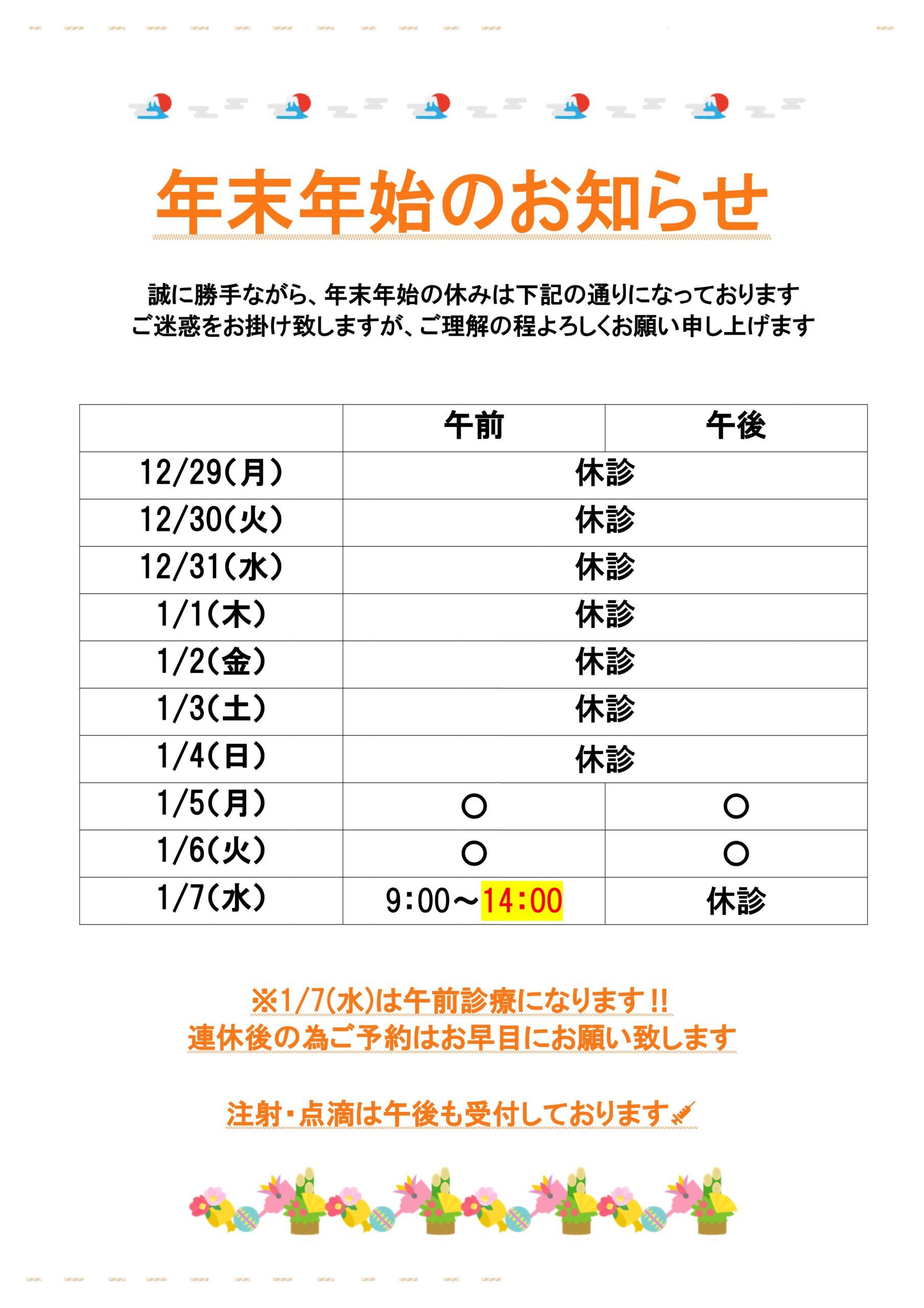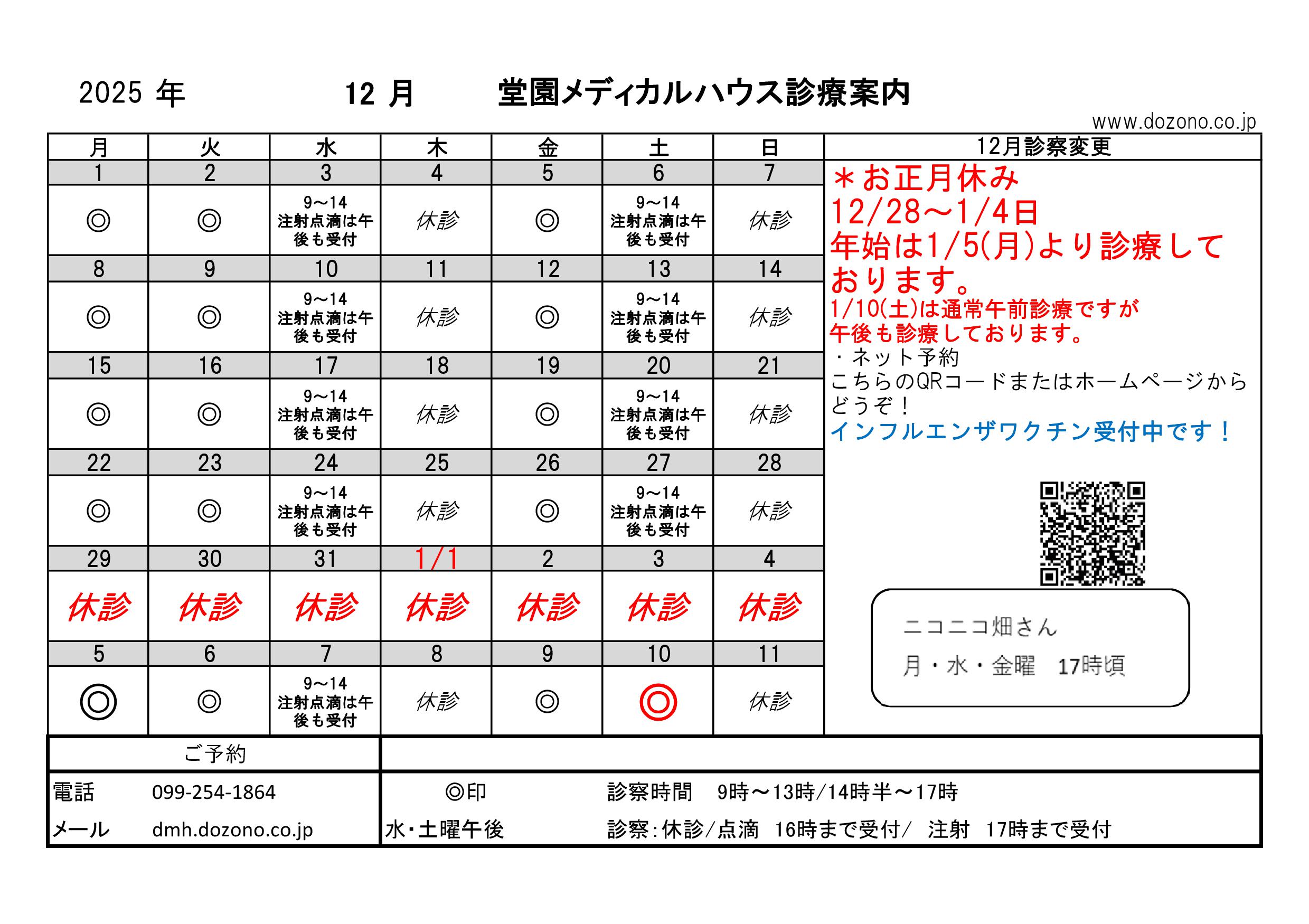 by 堂園メディカルハウス 12月の診療案内 12月の診療案内です☺ 🍀12月28日~1月4日は休診です 🍀年始1月10日(土)は通常午前診療ですが、午後も診療致します 🍀クロンスマートパスを導入しました!受付での会計がスキップできます♪ ご興味のある方は受付まで🤗 🍀お電話・メール・ラインからでもご予約できますので、ご利用くださいませ📲 🍀水曜・土曜午後は、点滴・注射は通常通り受け付けております★ *皮膚症状のある方の注射・点滴は、事前に院長の指示が必要な場合もありますので、 必ずご予約をお願い致します。 👑インフルエンザ予防接種も随時受付中‼ in 診療案内 / ブログ Share